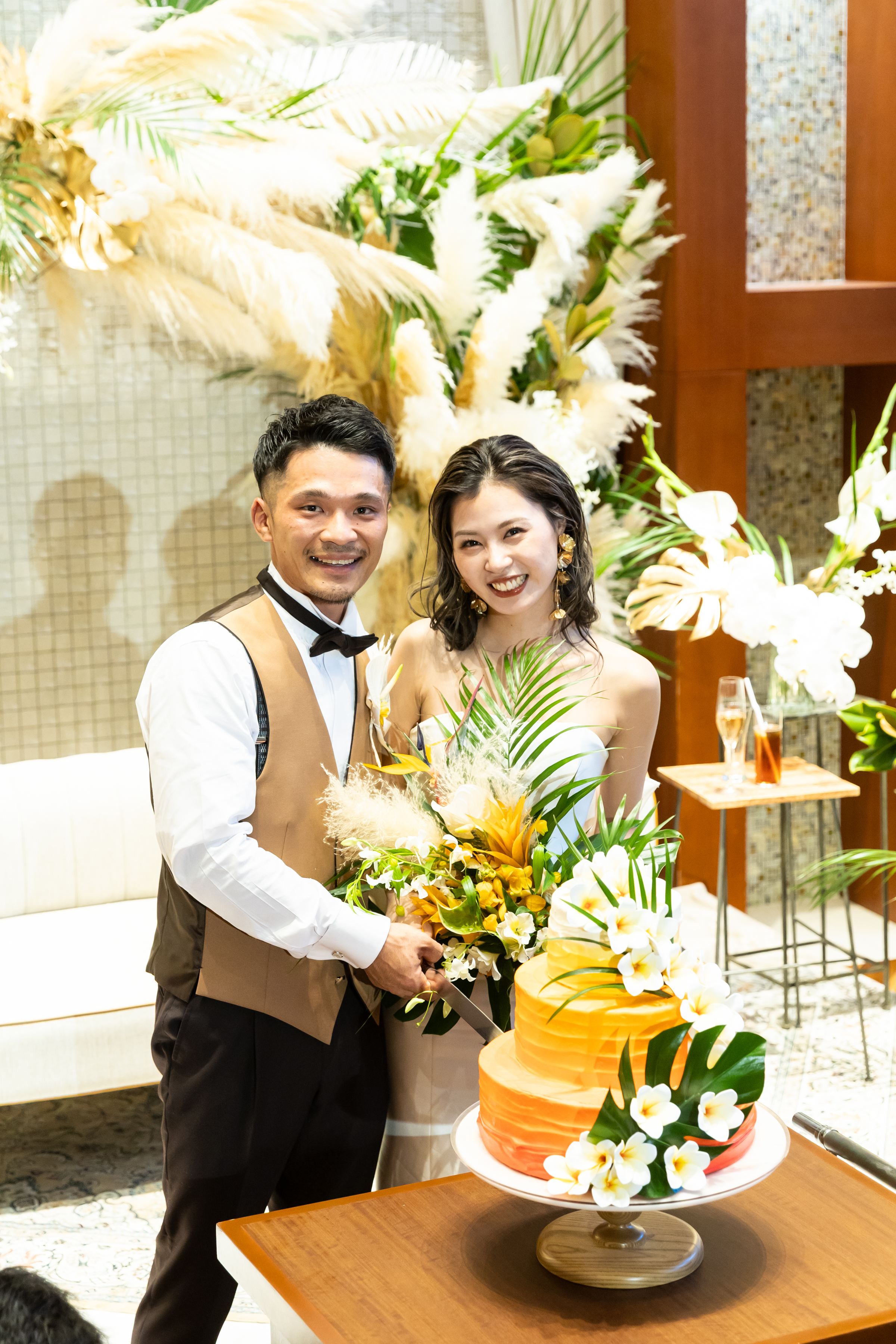 オレンジのグラデーションの3段ケーキにご入刀を行い
